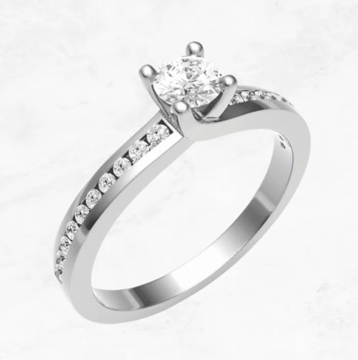This elegant engagement ring features a brilliant round-cut diamond securely held in a classic four-prong setting. The band is adorned with a row of sparkling round diamonds in a channel-set style, adding extra brilliance along the shank. The unique crossover design at the base of the setting offers a graceful and modern twist, making it a perfect choice for someone who values both tradition and contemporary elegance