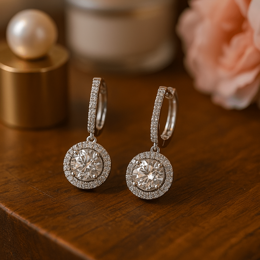 Bold, elegant, and modern — these princess-cut halo drop earrings are crafted to impress. Each earring features a striking square-cut center diamond, beautifully surrounded by a glittering halo of pavé-set diamonds. The radiant drop is suspended from a refined hoop, also adorned with diamonds for added sparkle.