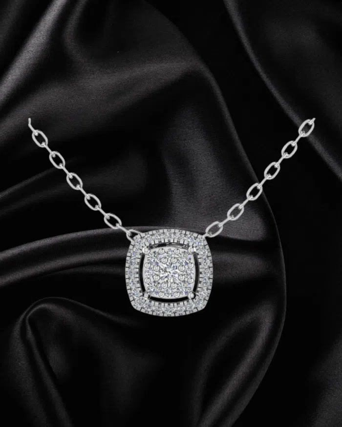 The Ready-to-wear Halo Cushion Pendant is a stunning and classic piece of jewelry that will add elegance and sophistication to any outfit. Meticulously crafted with an 18k gold stylish chain available in white, yellow, or rose gold.