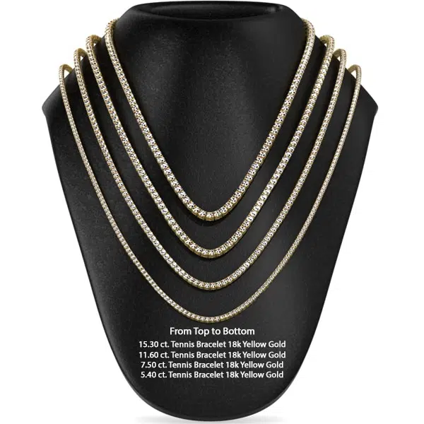 This ravishing classic diamond tennis necklace features 128 round, Color E/F, Clarity VS/TOP-SI (perfectly eye clean) diamonds set in a 18k white, yellow or pink gold bracelet. Each diamond is an average of 0.09 ct. giving this special and sparkling tennis neckalce a *total carat weight of 11.60 ct.