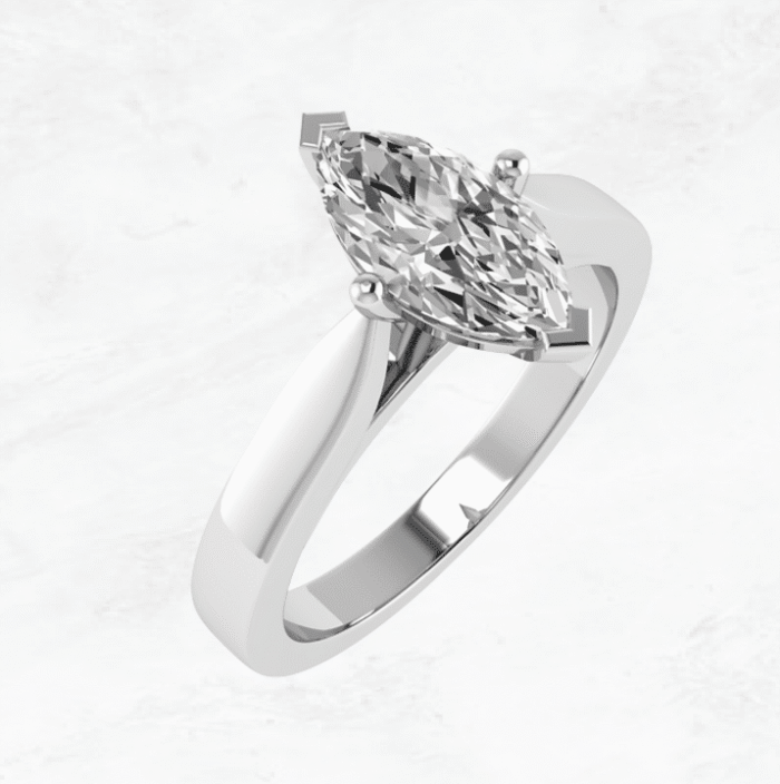 Belgium Diamonds Marquise Cut Solitaire Ring features an elegant 18k gold band with a sleek, modern design, highlighting a stunning marquise-shaped diamond in a secure 4-prong setting. The elongated cut enhances the finger’s appearance, adding a touch of timeless sophistication