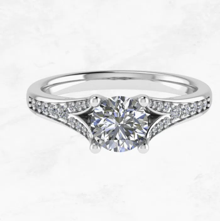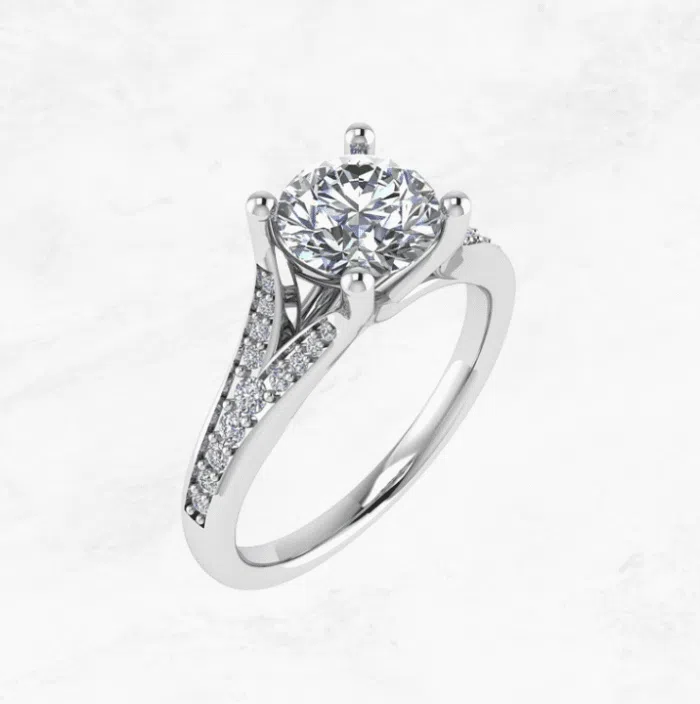 This captivating engagement ring features a brilliant round-cut center diamond set in a secure four-prong setting. The graceful split shank design is adorned with shimmering pavé-set diamonds, creating a stunning frame for the centerpiece. Crafted in high-polish white gold, the intertwining band design offers a romantic and modern twist, symbolizing two paths becoming one. Perfect for someone who loves timeless elegance with a touch of contemporary flair.