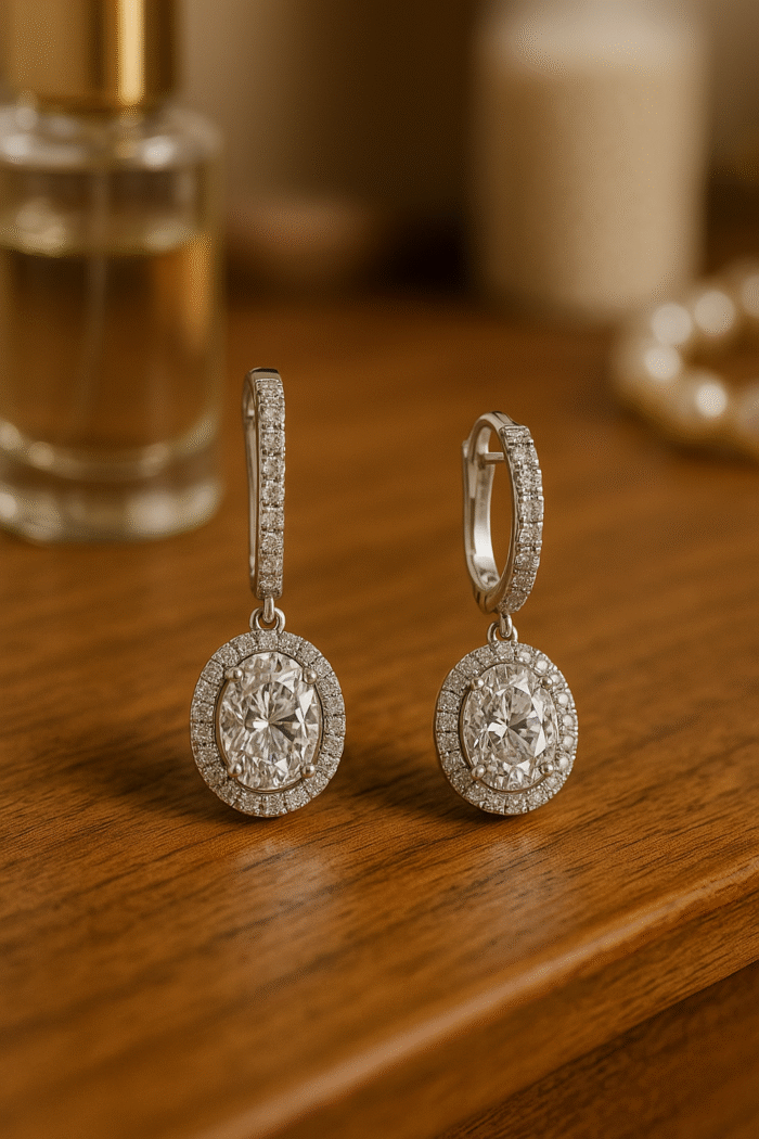 Graceful and eye-catching, these oval-cut diamond drop earrings feature a brilliant center stone framed by a double halo of pavé-set diamonds for amplified sparkle. The elegant oval shape adds a soft, feminine touch, while the drop hangs from a diamond-encrusted hoop for a refined finish.