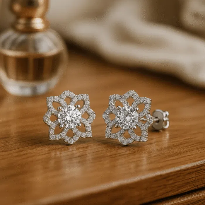 Elegant and intricately designed, these floral diamond stud earrings combine timeless beauty with a romantic aesthetic. At the center, a brilliant round diamond is surrounded by delicate openwork petals outlined in pavé-set diamonds, forming a symmetrical floral silhouette.